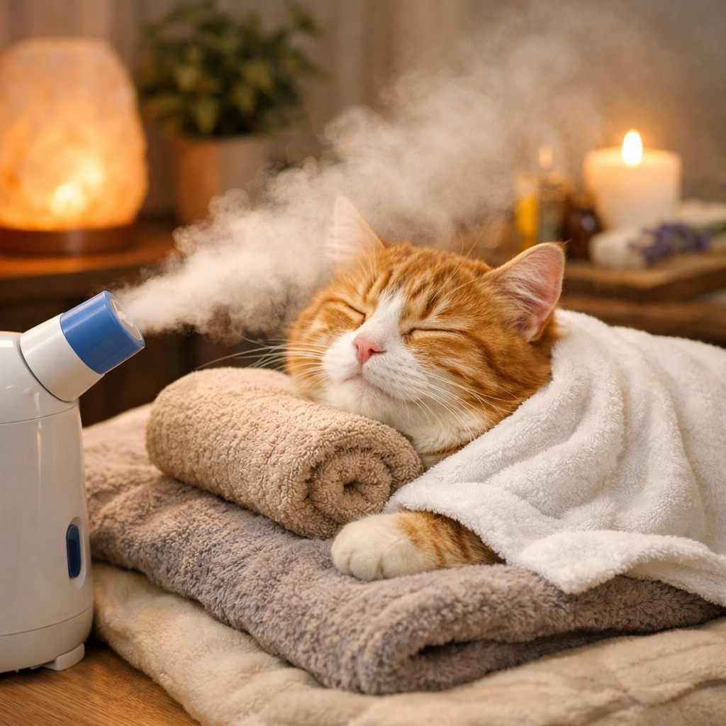 No. Many essential oils are toxic to cats, including popular ones like eucalyptus, tea tree, and peppermint. Strong vapours from menthol rubs can also irritate feline airways rather than soothe them. Stick to vet-approved treatments and simple humidity methods like sitting in a steamy bathroom. If you’re unsure whether a product is safe, always ask your vet before using it around your cat.