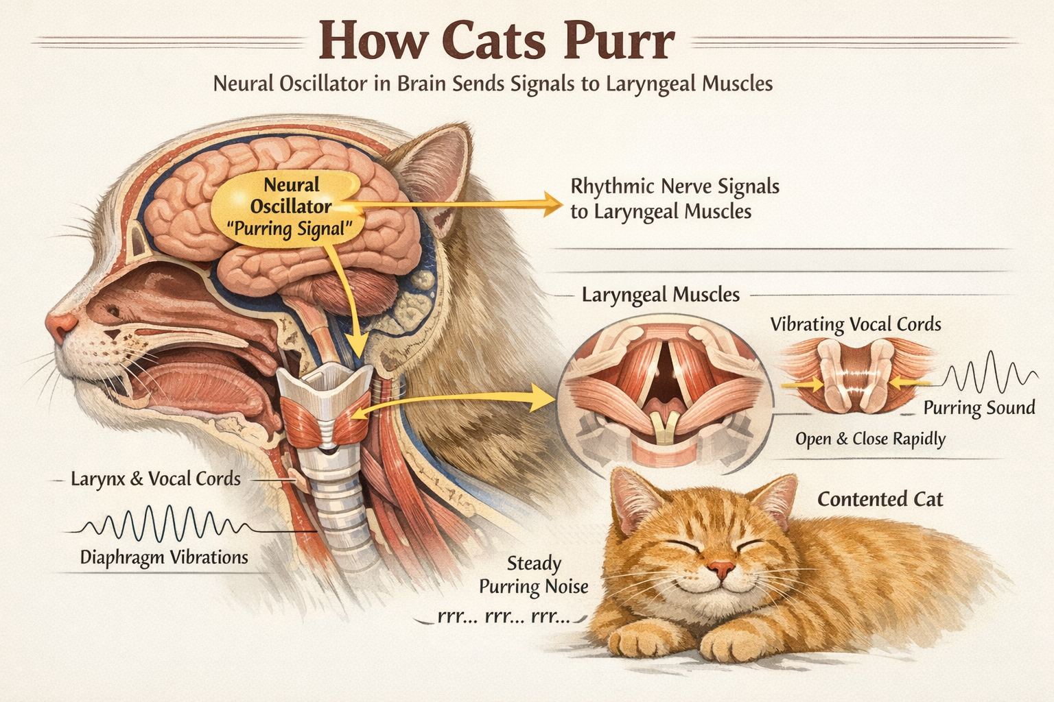 The magic of purring starts deep within the cat’s body. As a cat breathes, a neural oscillator in the cat’s brain sends rhythmic signals to the laryngeal muscles in the voice box. This neural oscillator is a unique internal mechanism within the cat's brain, responsible for producing the rhythmic firing that results in purring. These muscles rapidly open and close the glottis—the space between the vocal chords—causing the vocal chords to vibrate and produce that familiar, soothing sound. This unique mechanism is a hallmark of domestic cats and a few related species, setting them apart in the animal kingdom.