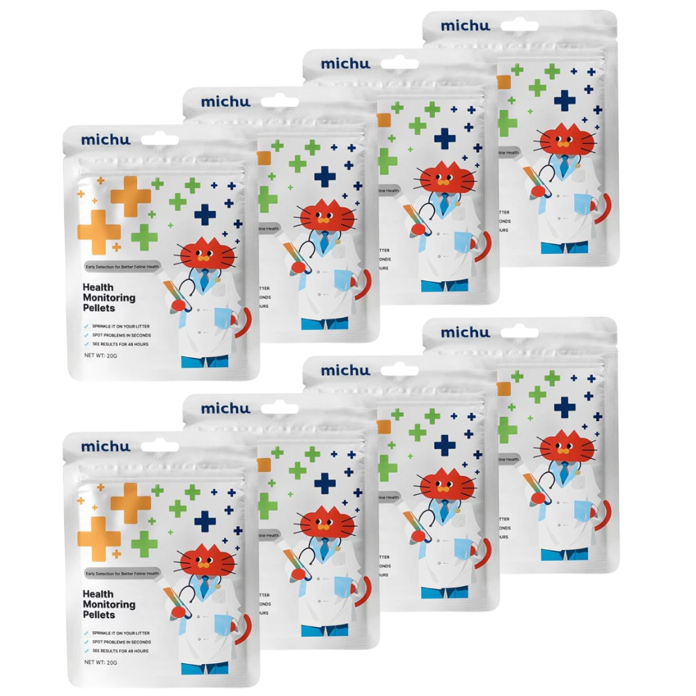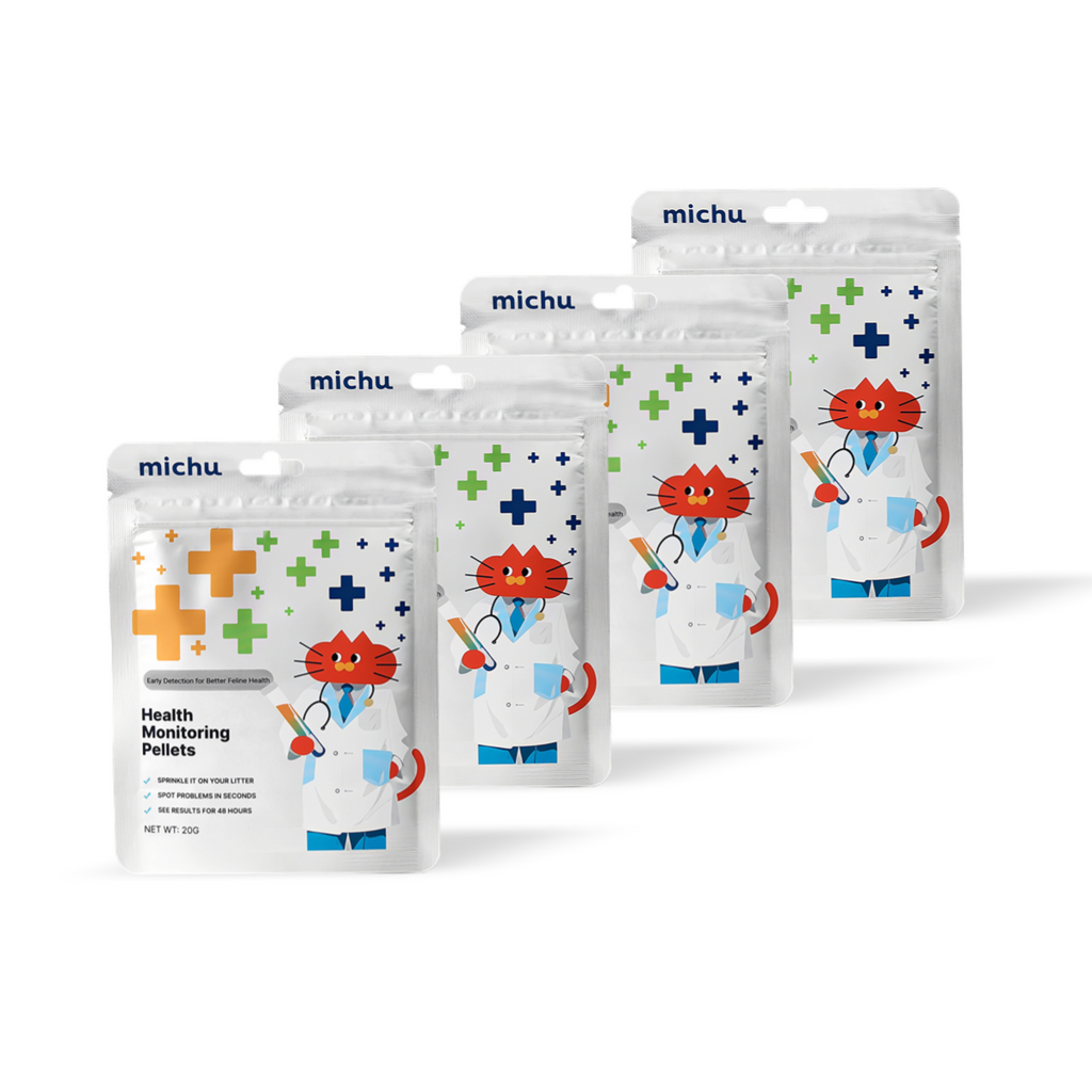 Monitor your cat's urinary health with Michu Cat Health Monitoring Pellets, detecting potential problems like urinary tract infections, acidosis, kidney stones, diabetes, blood in the urine, and more, right from the comfort of your home.