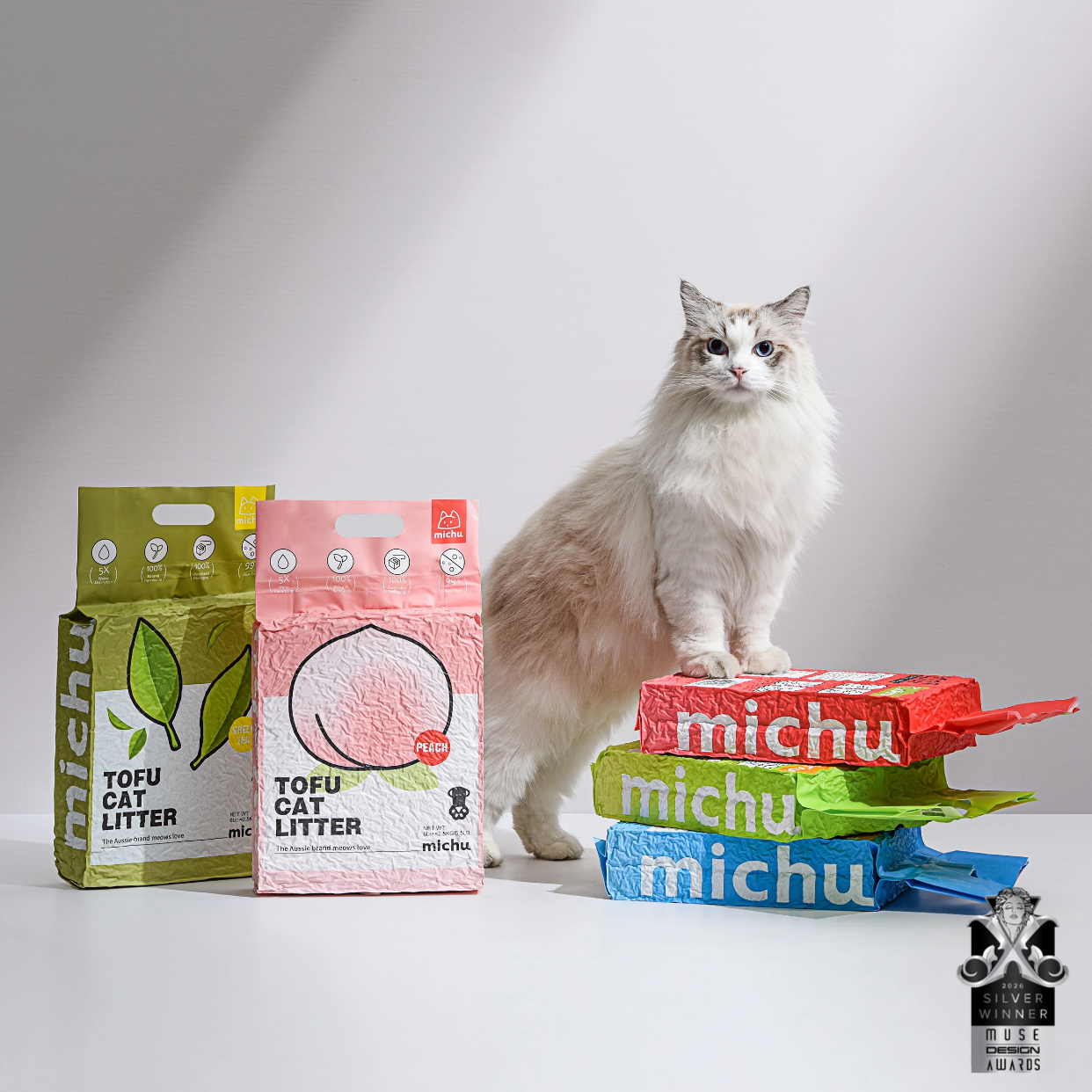 Say goodbye to messy storage with Michu's compact packaging. Simply open a 5.5lb bag, pour it into the tray, and recycle the empty bag. The sleek design of Michu packaging makes it easy to store on a small shelf in any cupboard or pantry, keeping your space tidy and organized.